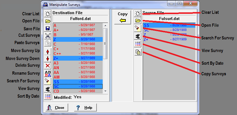 Saving Changes. When you've finished copying, moving, deleting and renaming surveys, you can then save the changes and the program will copy the surveys shown in the Destination List to the file you specify.